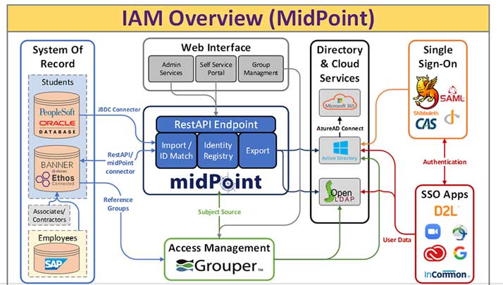 We’ve discerned that both alterations in business processes and technological advancements will be pivotal in attaining our envisioned end state. These modifications encompass shifts in student statuses and the management of their accounts throughout their academic journey, both before and after graduation. Additionally, the onboarding and offboarding of employees will be governed by an HR system. In the interim, we will implement Microsoft Identity Manager to deliver this solution as we enhance our expertise in midPoint.