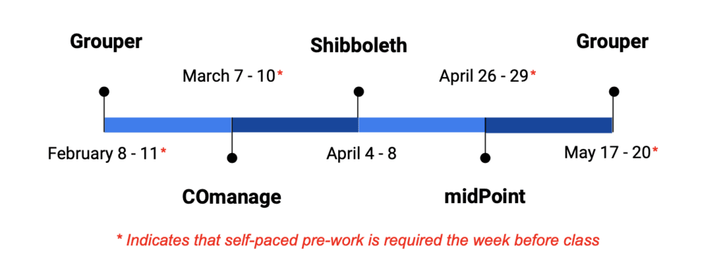 The InCommon Academy is offering virtual training sessions for each of the four InCommon Trusted Access Components this spring. The software training workshops are developed by community members and taught by the software developers and implementers.