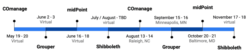 Registration is open for COmanage, Grouper, and midPoint. We have plans to offer Shibboleth virtually this summer. If face-to-face is more your speed, we hope to resume our in-residence workshops this fall. The full schedule is on our website; a summary is below.