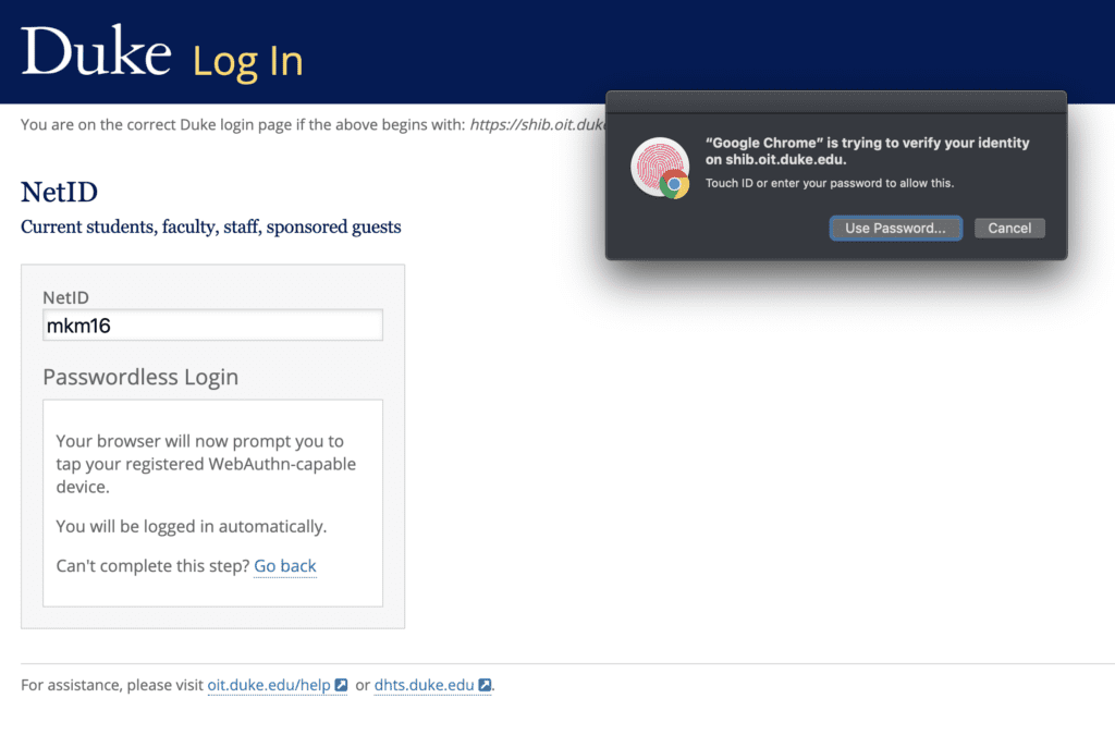 Duke Unlock lets you access your Duke account as easily as you unlock your phone. Unlike current multi-step login methods, Duke Unlock opens the door to enhanced convenience while retaining credential security by using your trusted device’s native capabilities in place of a password and secondary verification process.