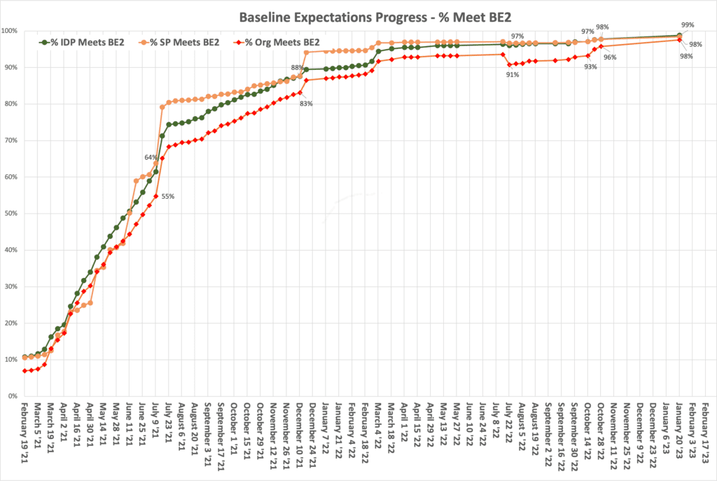 As of January 2023, more than 98% of InCommon-registered entities (99% of the identity providers and 98% of the service providers) meet BE2 requirements.
