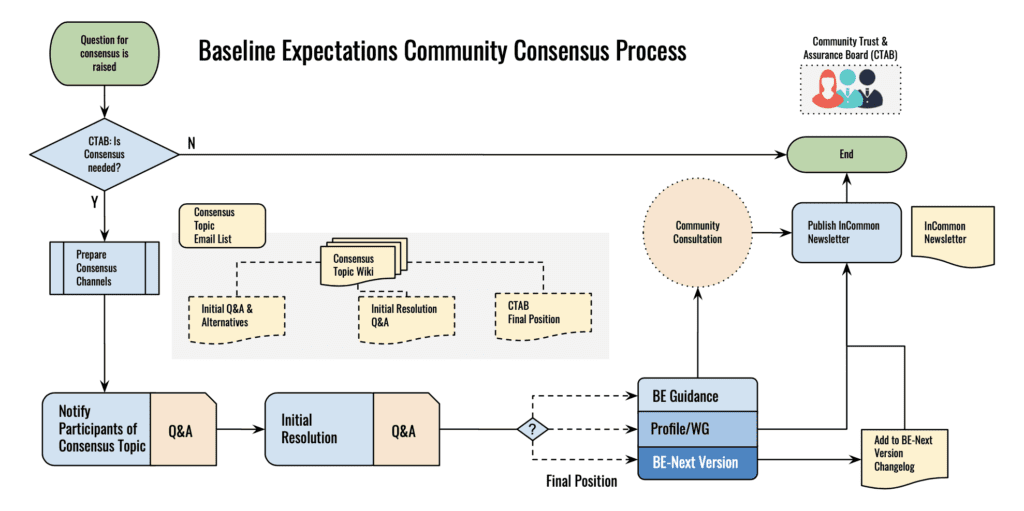 The following process outlines repeatable steps the Community Trust and Assurance Board (CTAB) will use to facilitate community discussion and consensus in support of Baseline Expectations for Trust in Federation. This process is initially described in Process to Maintain Baseline Expectations by InCommon and its Members. The present document defines the community discussion and consensus process at a greater level of detail. It may be updated over time as the community gains experience at answering questions of consensus. Visit the Baseline Expectations Program page for the latest information.